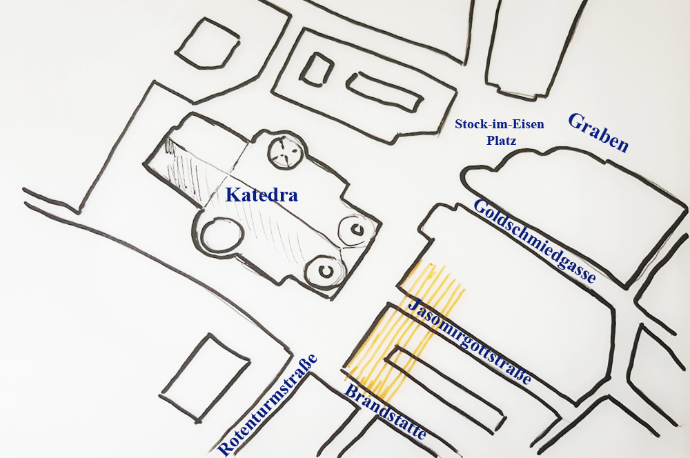 To całkiem niedaleko, praktycznie naprzeciw Katedry w miejscu, gdzie dzisiaj biegną ulice Brandstätte, Bauernmarkt i Jasomirgottstraße.