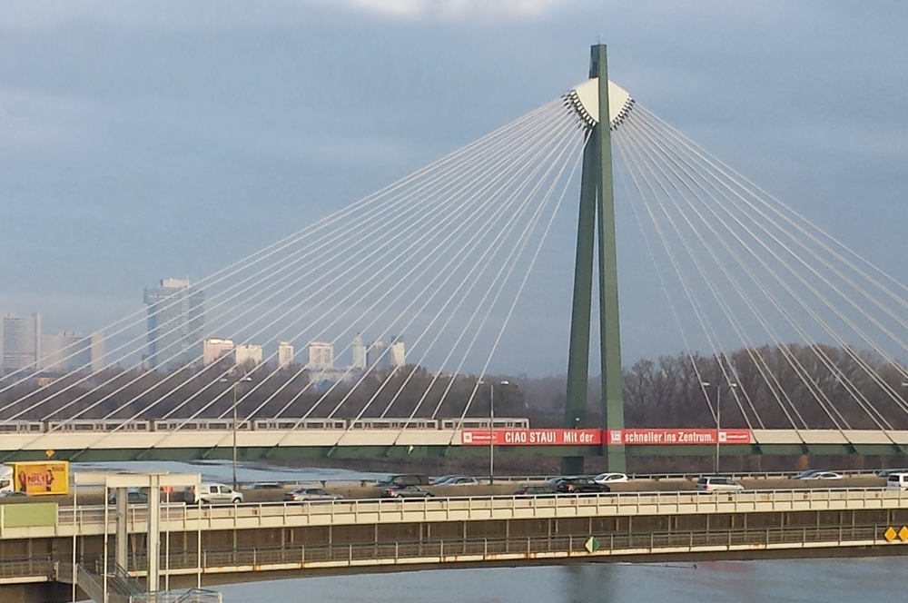 Ten ładniejszy, z wielkim filarem i linami, to Donaustadtbrücke. Dzisiaj to most, po którym jeździ linia metra U2. Otwarto go w 1997 roku.