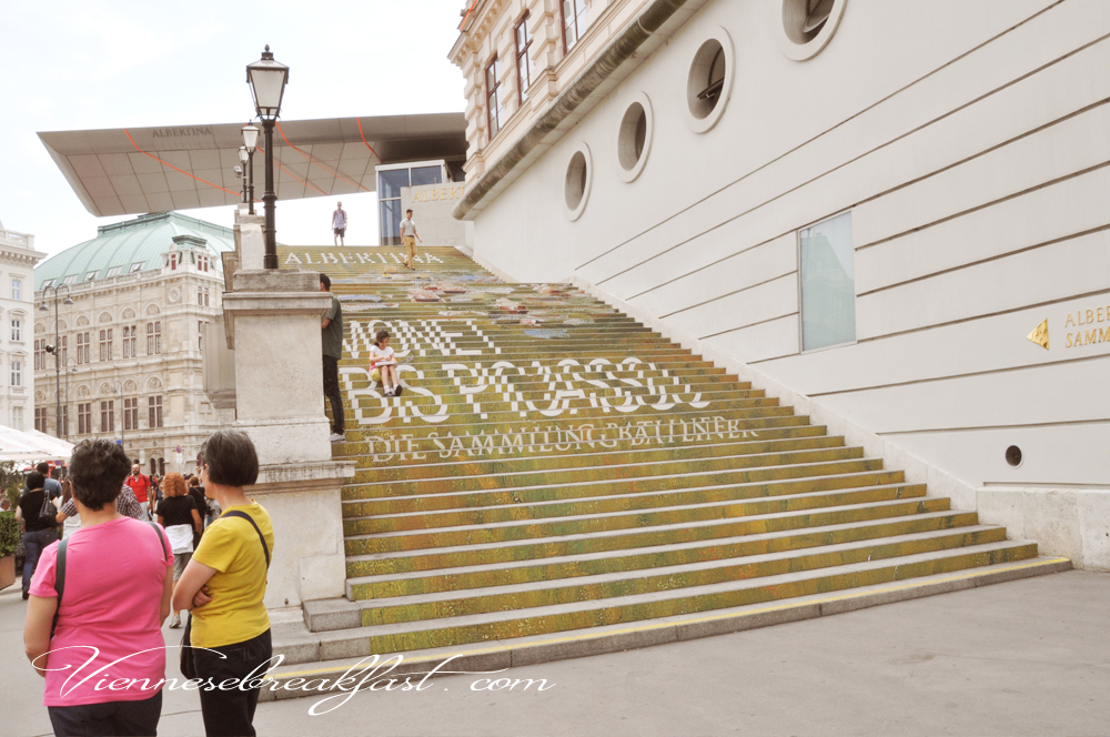 Lubię schody do Albertiny, są dość niezwykłą reklamą jej aktualnych wystaw.