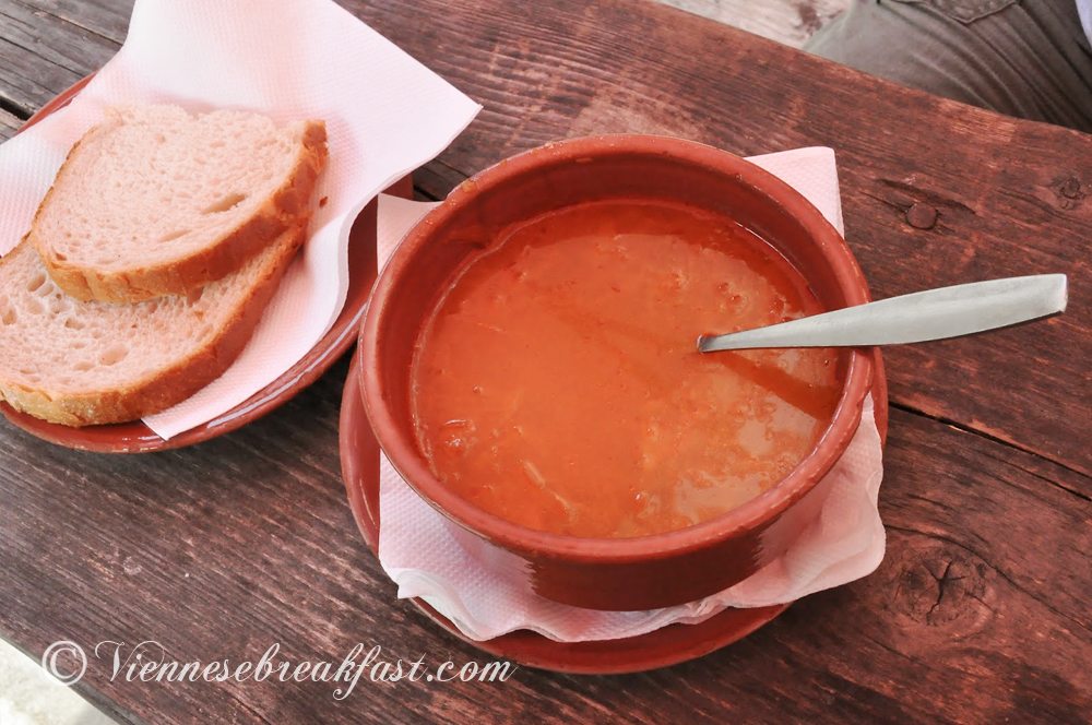 Knedel z gulaszem, zupę przypominającą kapuśniak w smaku, a pomidorową kolorem no i wypić słowackie piwo. Zupa wyglądała tak:
