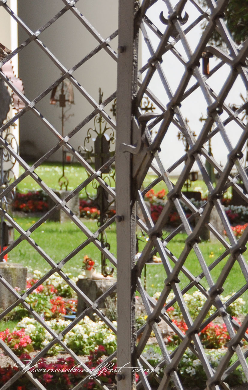Z tyłu bazyliki jest mały przyklasztorny cmentarz. Na grobach stoją metalowe, kute krzyże a wchodzi się do niego przez kutą bramę. To było takie spokojne miejsce bez grama tej cmentarnej powagi i smutku. Proste, jasne.
