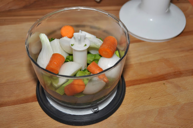 Seler, marchewka, cebulka do blendera i siekam na drobne kawałeczki.