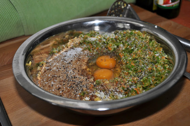 Rozdrobnione jajka, bułka tarta, posiekane jarzyny, 3 surowe jajka, sól i pieprz do miski.