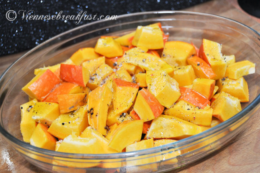 Pokrojoną dynię solę i nie żałując go obsypuje grubo mielonym kolorowym pieprzem oraz polewam oliwą.