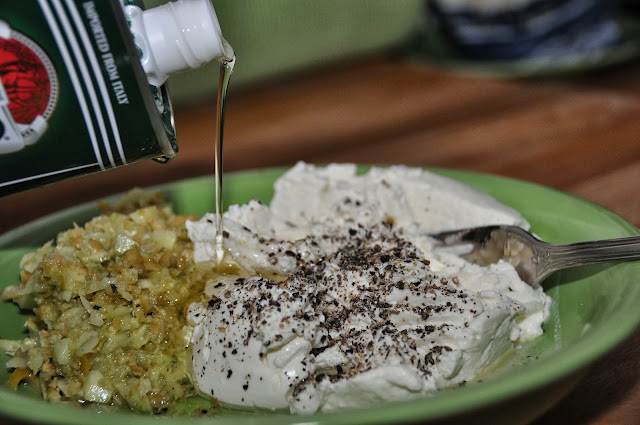 Posiekane oliwki i ogórek oraz pieprz dodaję do ricotty.