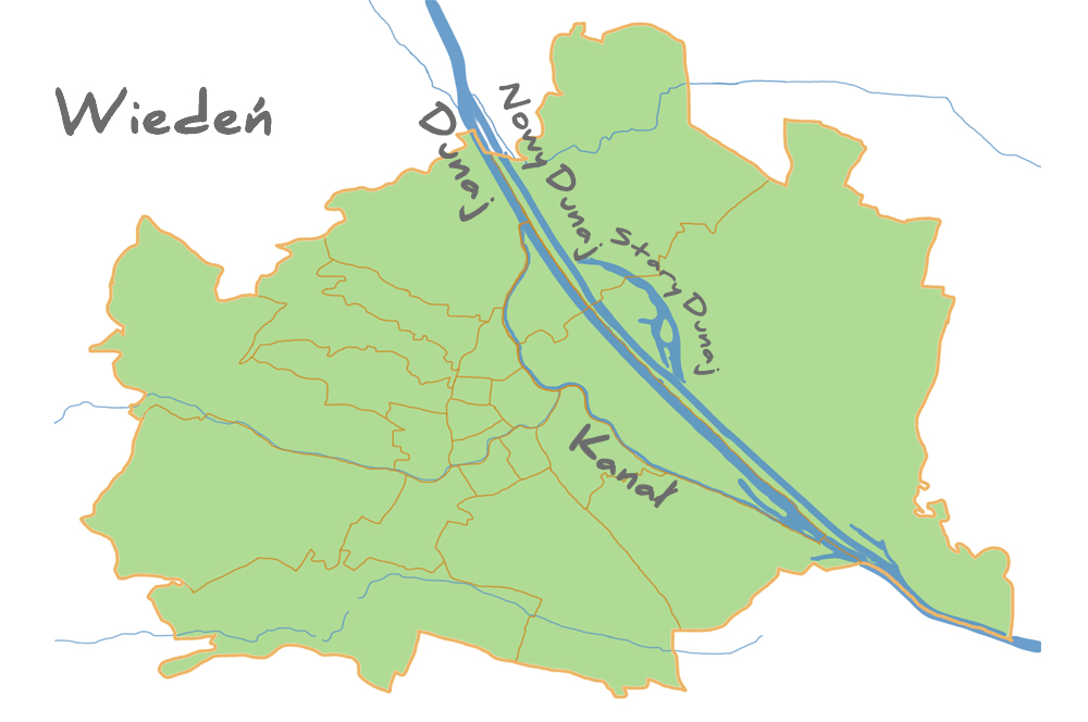 Patrząc na współczesną mapę Wiednia widzimy miasto przecięte prawie prostą linią podwójnego koryta rzeki.